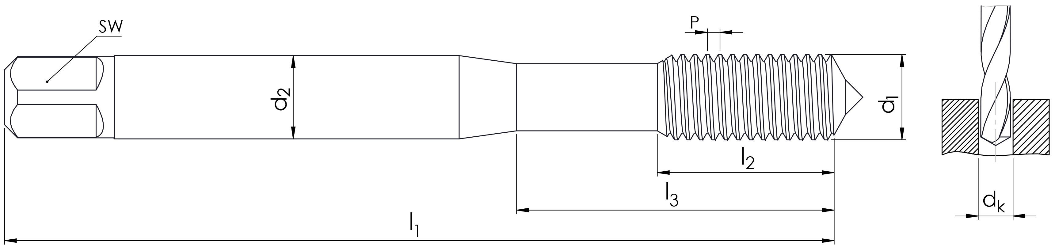 | d1 | Kare Genişliği (SW) | Şaft Çapı (d2) | Tam Uzunluk (L1) | Diş Uzunluğu (L2) | Kanal Uzunluğu | Diş Adımı (P) | Delik Çapı | Standart |
